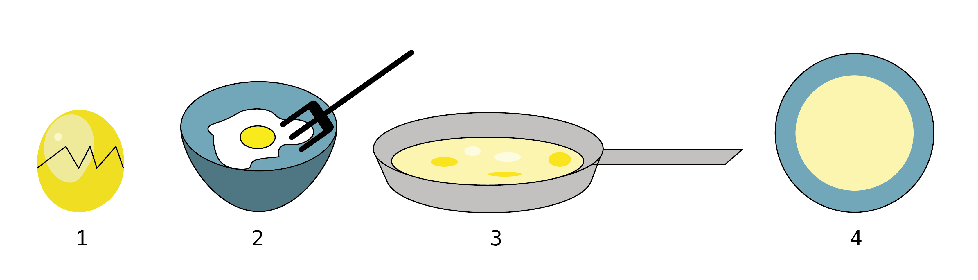 Un mode d’emploi, ou une recette, décrit les étapes à suivre pour arriver à une solution. Dans le cas d’une recette de cuisine, la préparation des ingrédients, leur cuisson et leur présentation sont différentes étapes que l’on peut suivre pour réaliser un plat. Prenons un cas précis : faire une omelette. Pour chaque étape de la préparation de l’omelette, il faut prévoir une marche à suivre suffisamment détaillée, afin que la personne qui suit la recette arrive au résultat souhaité. Dans le cas de l’omelette, les opérations pourraient être (voir figure ci-dessous) :