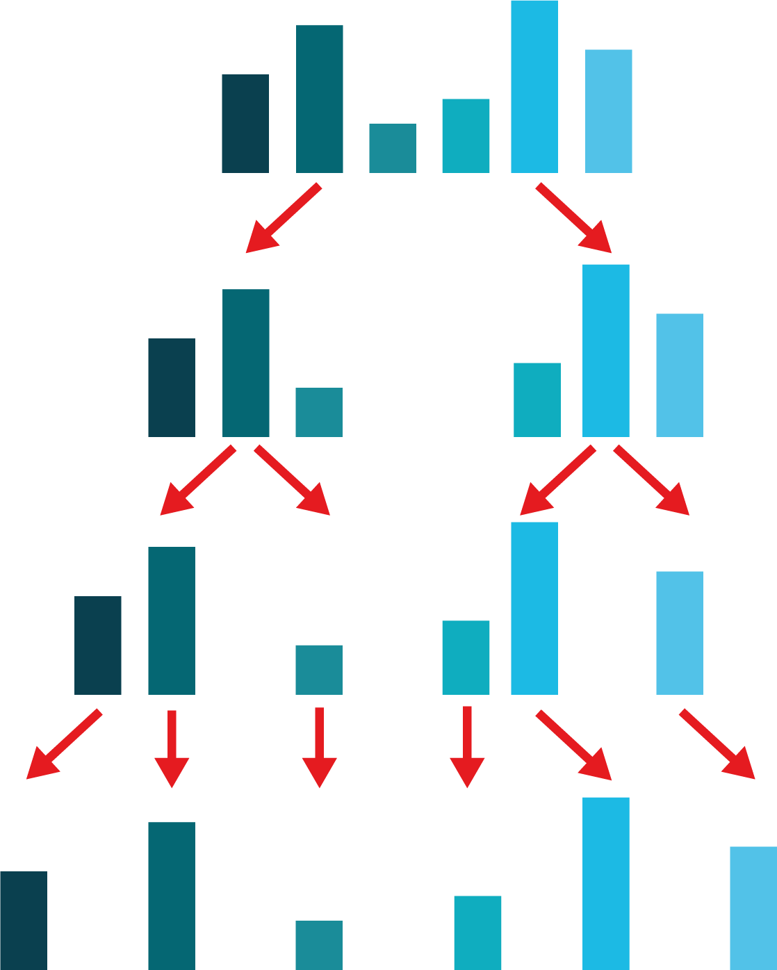 Fig. 5.6 Phase de division. Illustration de la première phase du Tri par fusion : on commence par diviser le tableau en deux, puis à chaque étape on divise à nouveau les tableaux ainsi obtenus par deux, jusqu’à ce qu’il n’y ait plus que des tableaux à \(1\) élément.¶