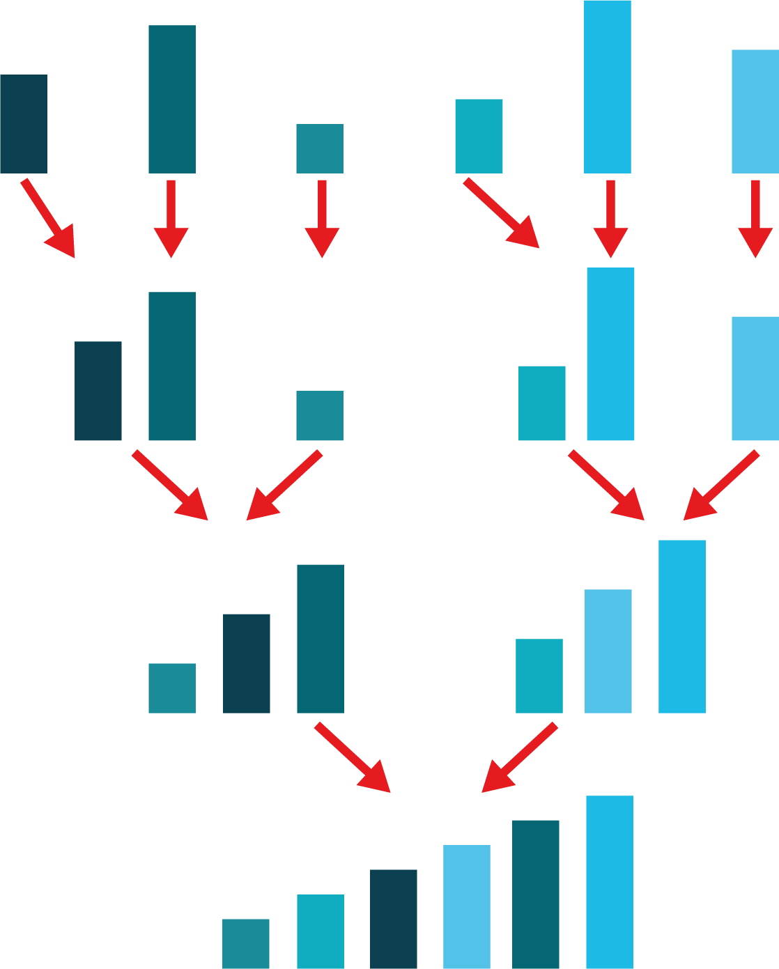 Fig. 5.7 Phase de fusion. Illustration de la deuxième phase du Tri par fusion : on commence par fusionner les tableaux à un élément, en faisant attention à respecter l’ordre de tri (ligne 2) ; puis par fusionner à nouveau les tableaux obtenus à l’étape précédente, toujours en respectant l’ordre de tri (lignes 3 et 4). On continue de la sorte jusqu’à ce qu’il n’y ait plus qu’un tableau unique (ligne 4).¶