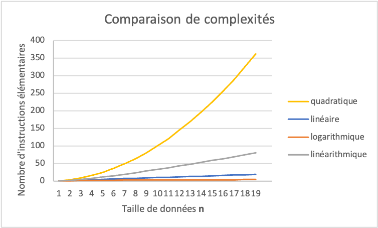 Fig. 4.10 Comparaison de complexités. La vitesse de croissance en fonction de la taille du tableau n est montrée pour toutes les complexités vues jusqu’ici. Plus le nombre d’instructions élémentaires est grand en fonction de la taille des données, plus l’algorithme est lent.¶